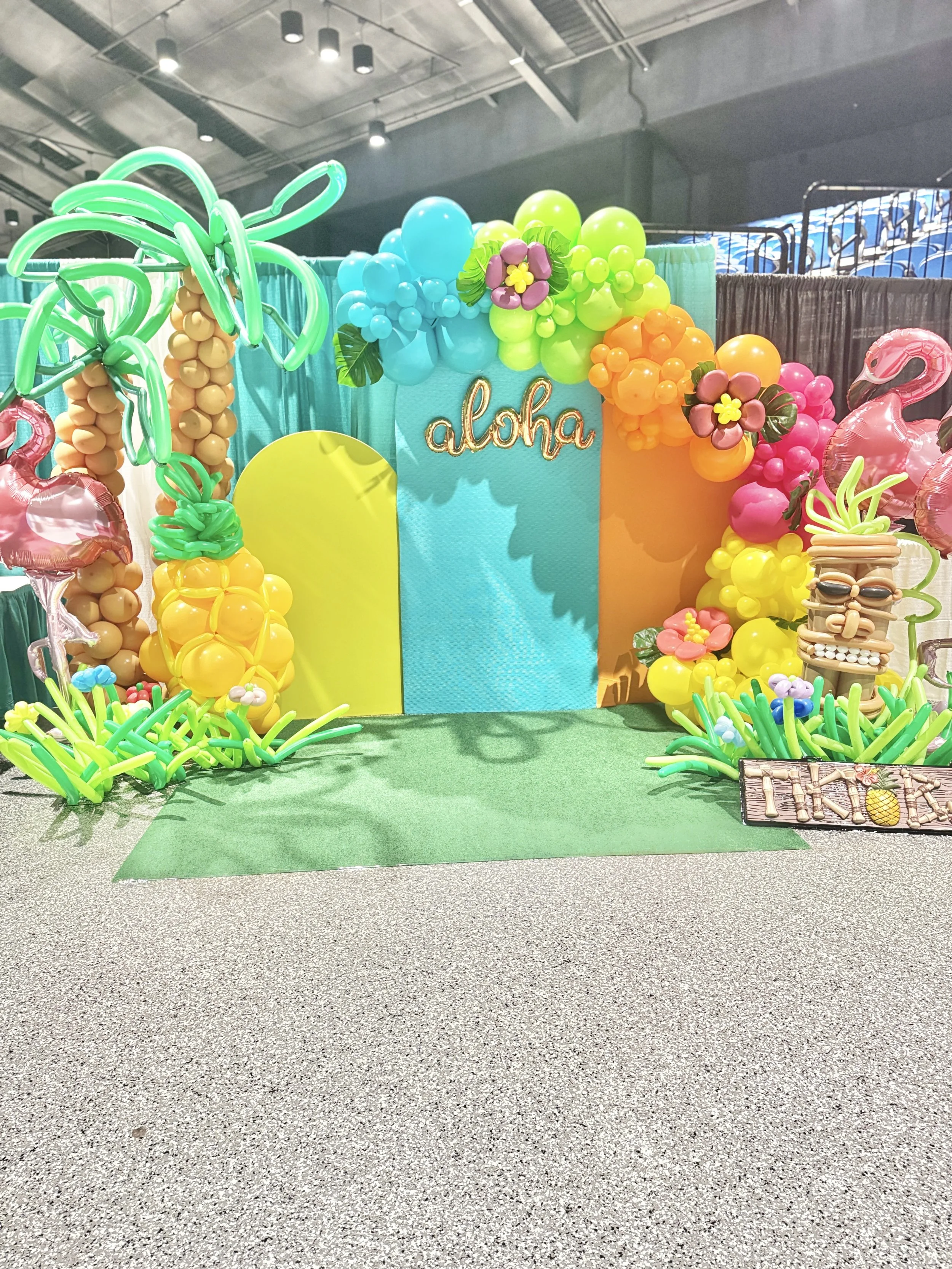 Includes 7x7 hedge wall rental, 10x10 Rainbow Palm Tree Arch, and neon signage rental