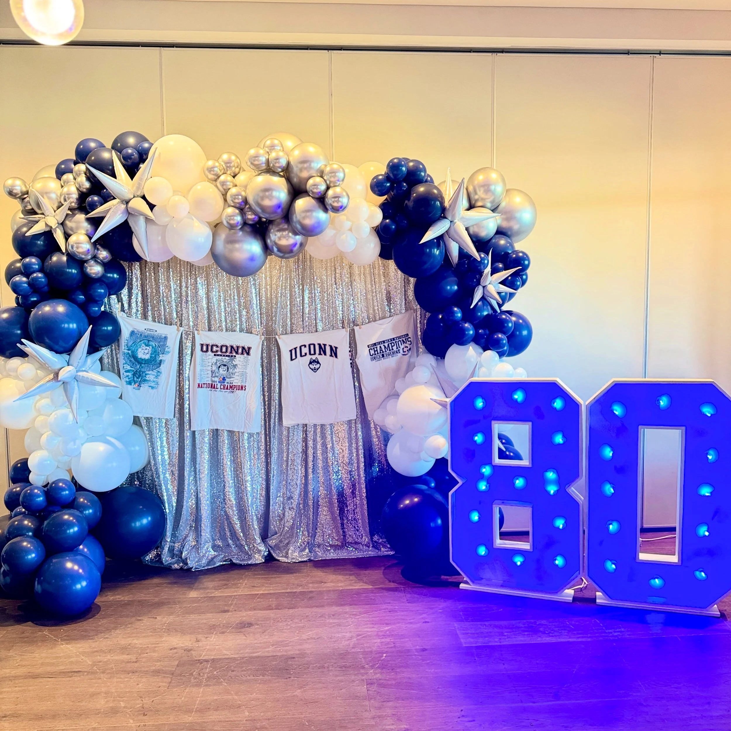 Sequin Fabric Backdrop & Full Organic Garland w/ Light Up Marquee